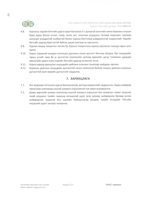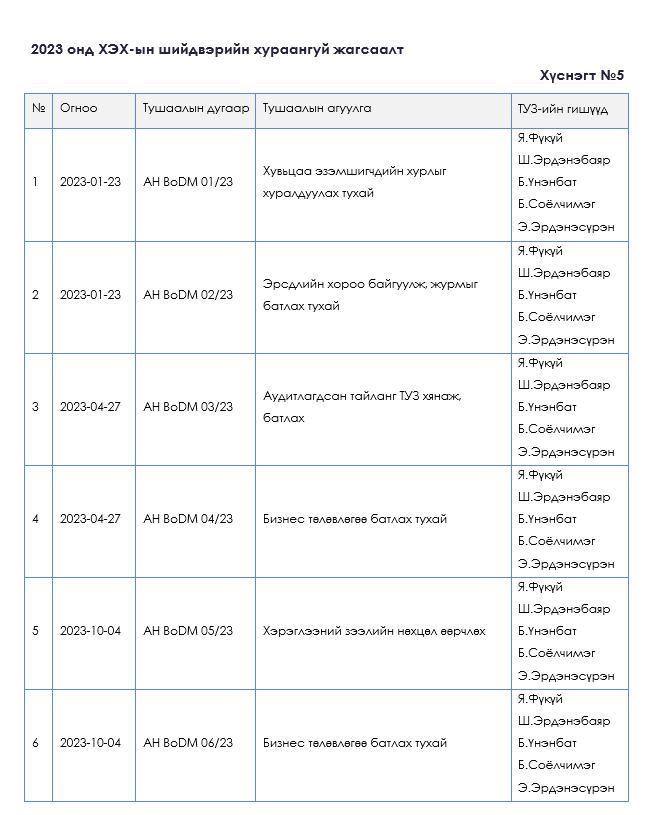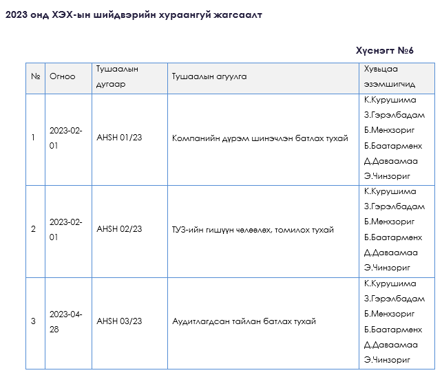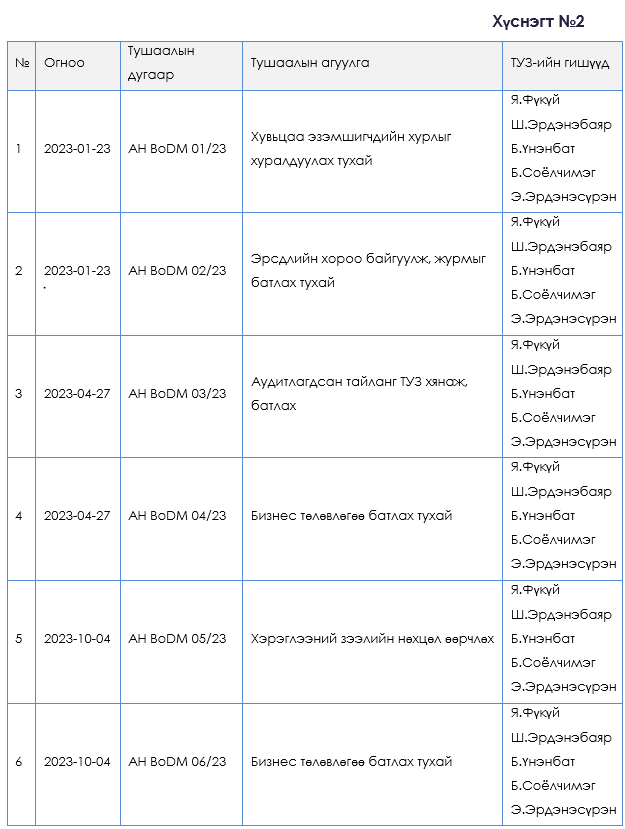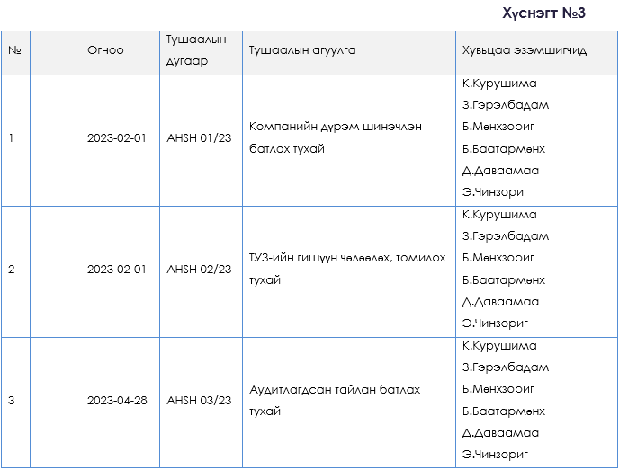 2023 онд ТУЗ-ийн Нарийн бичгийн дарга нь дараах ТУЗ-ийн тогтоол, Хувьцаа эзэмшигчдийн хурлын шийдвэрүүдийг гаргахад хурлын зар түгээх, хуралд бэлтгэж, холбогдох баримт бичгүүдийг хариуцаж ажилласан.