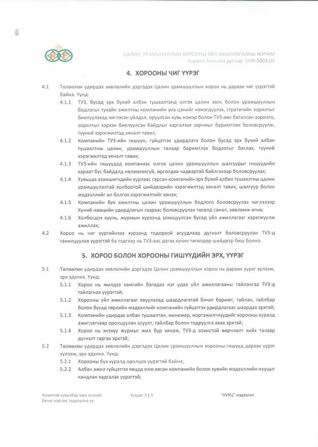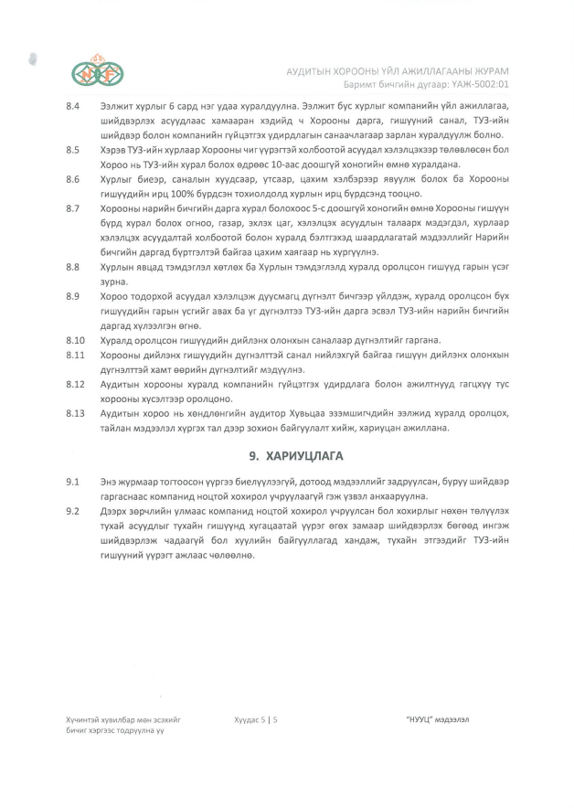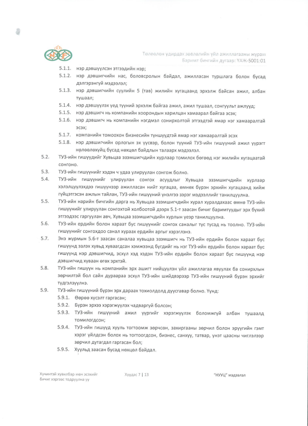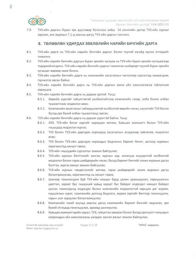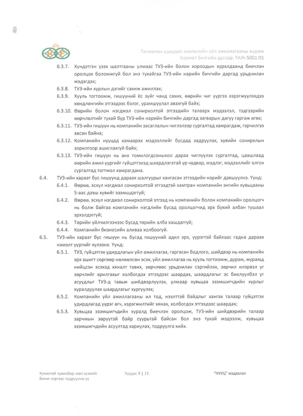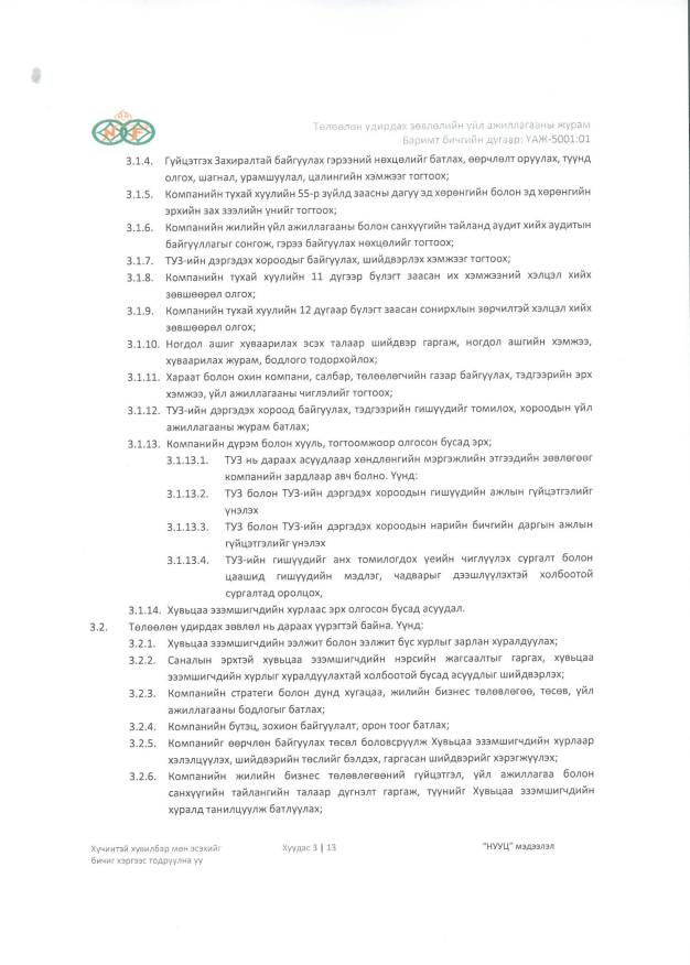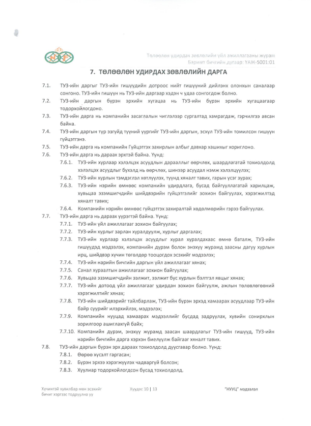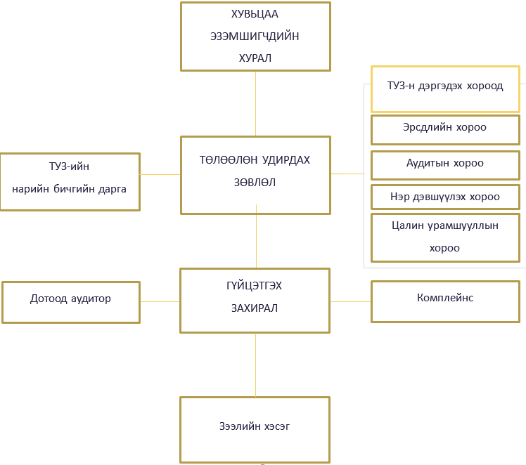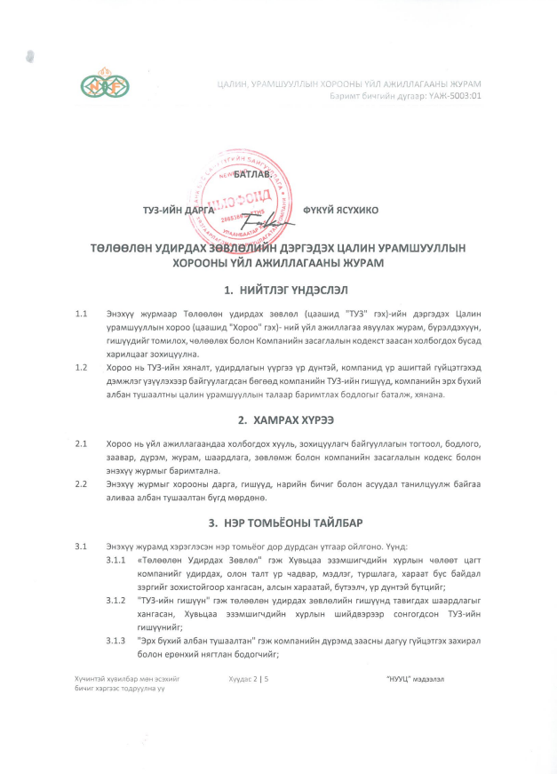 Санхүүгийн Зохицуулах хорооны 2022 оны 03 сарын 23 өдрийн “Компанийн засаглалын кодекс” –ийг шинэчлэн батлах тухай тогтоолыг үндэслэн, 2022 оны 10 дугаар сарын 5-ний өдөр Төлөөлөн Удирдах Зөвлөлийн 03/22 тушаалын шийдвэрээр “ТУЗ-ийн үйл ажиллагааны журам” батлагдсан.