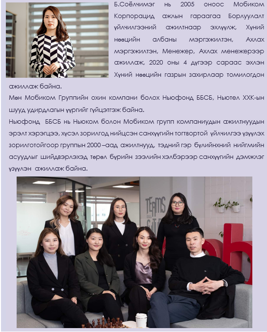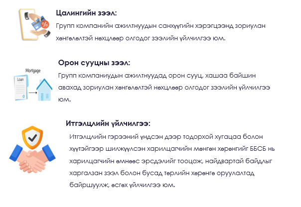 АЛСЫН ХАРАА: Группийн компаний ажилтнуудын санхүүгийн хэрэгцээг хангах, Монгол Улсын нийгэм, эдийн засгийн хөгжилд хувь нэмрээ оруулахад чиглэсэн санхүүгийн үйлчилгээг тогтмол үзүүлэх явдал юм.