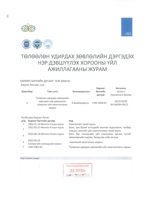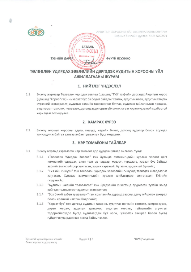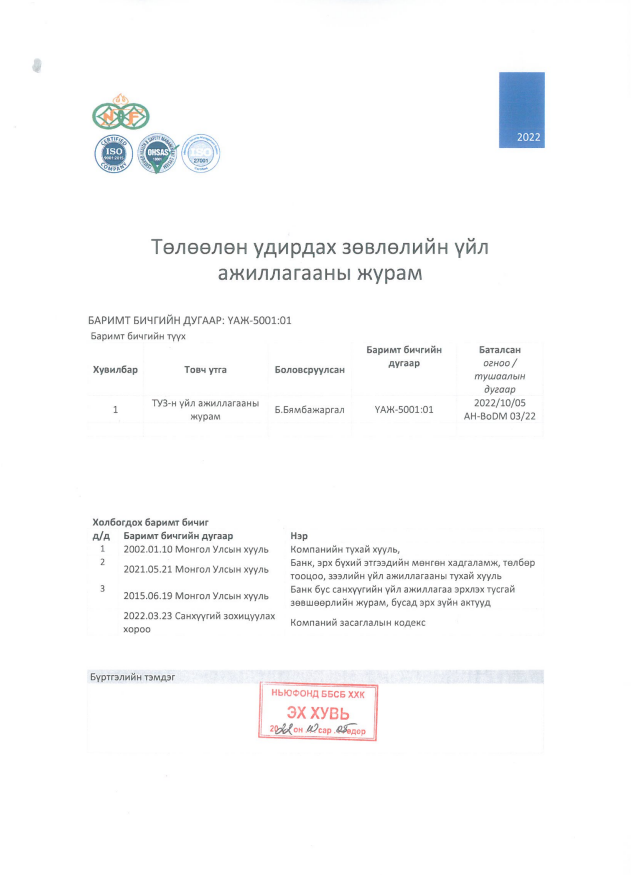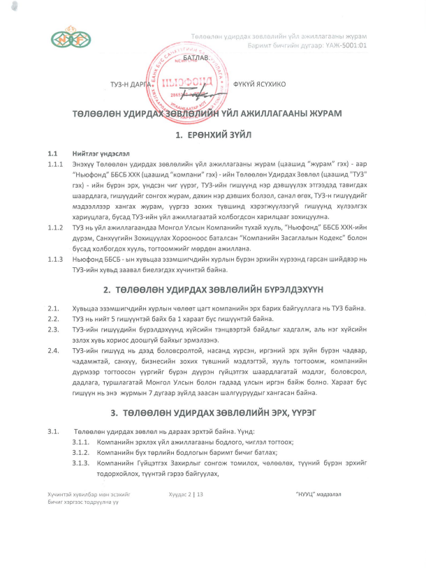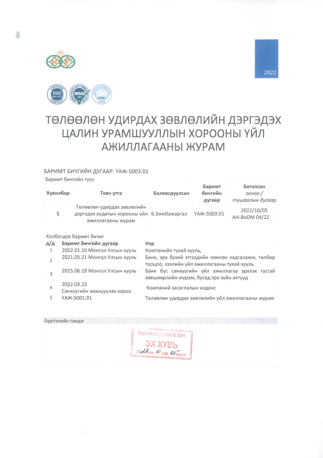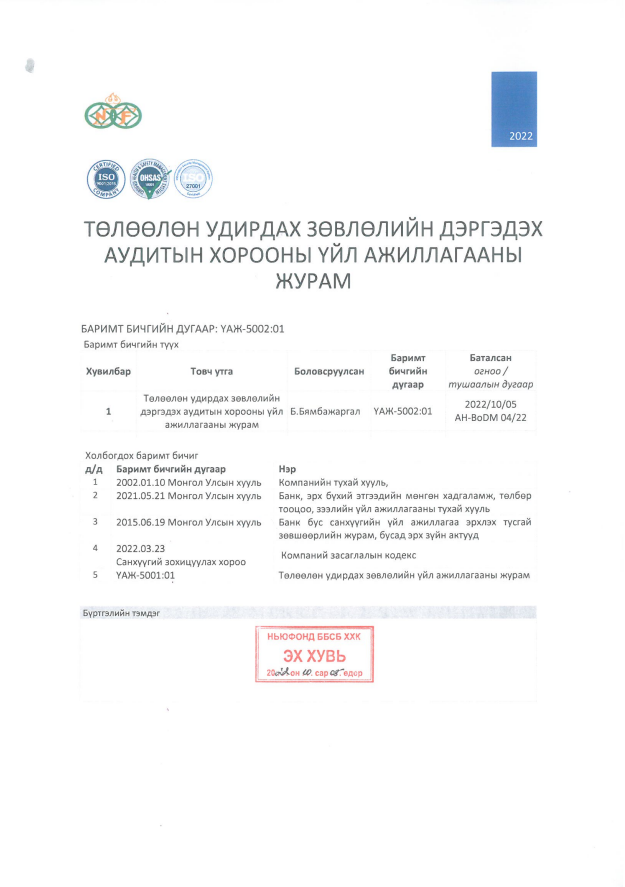 2022 оны 10 дугаар сарын 5-ны өдөр батлагдсан “Ньюфонд” ББСБ ХХК-ийн “ТУЗ-ийн үйл ажиллагааны журам”-ын дагуу ТУЗ-ийн үйл ажиллагааг зохион байгуулж, гүйцэтгэлийн арга замыг тогтоож, хэрэгжүүлэх бүтцийн дагуу чанд мөрдөж ажилласан болно.